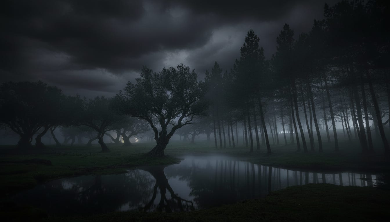 Então, uma linha da cor da lua começou a divisar lentamente o seu corpo, enquanto a noite se tornava um escuro breu. Clarões de relâmpago mostravam agora o terreno como quadros de uma exposição a céu aberto… Um raio rasga à sua frente, repentino. Ajoelha-se tremendo, a boca seca, o chão se aprofundando… E tremia ainda quando o novo clarão fazia ver um carvalho caído e decepado.